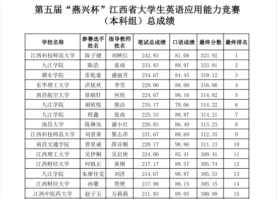 10月25日至26日,由江西省教育厅主办,江西师范大学和北京燕兴国际教育集团联合承办,江西省外语学会协办的第五届“燕兴杯”江西省大学生英语应用能力竞赛决赛在江西师范大学成功举办。经过复赛、决赛两轮的激烈角逐,我校外国语学院派出的竞赛选手斩获四个省级一等奖,获奖选手总分在全省所有参赛本科院校中排名第一,创下了我校在该项赛事中取得的历史最好成绩。