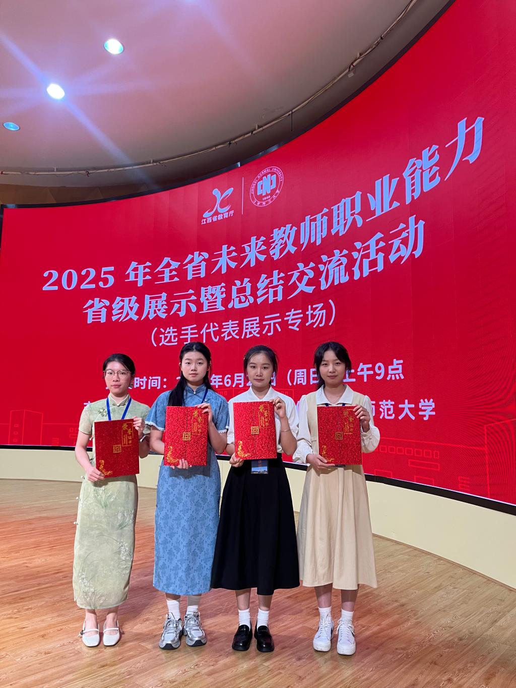 近日,由江西省教育厅主办、江西师范大学承办的“2025年全省未来教师职业能力省级展示暨总结交流活动”在江西师范大学瑶湖校区圆满落幕。我校共选派7名选手参赛,经过激烈角逐,4人荣获三等奖,展现了学校师范生扎实的专业素养和教学能力。