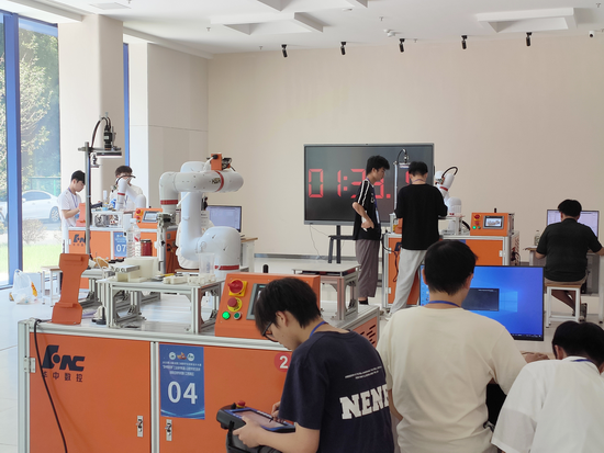 比赛设工业协作机器人应用挑战赛和数字孪生技术创新赛两大板块。前者要求2小时内完成机器人编程、协同作业及精密装配等任务,检验选手对机器人控制、路径规划的实战能力;后者需构建高保真数字孪生模型,实现远程监控与智能决策,重点考察创新思维和工程实践能力。赛场上,各队选手通过机械臂精准操作展现智能制造的高效与高精度,模型精度、算法优化等能力也得到充分检验。